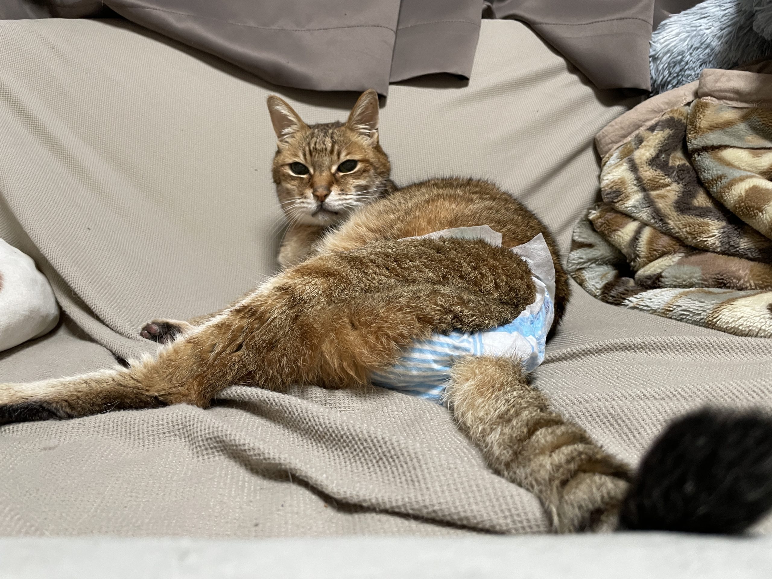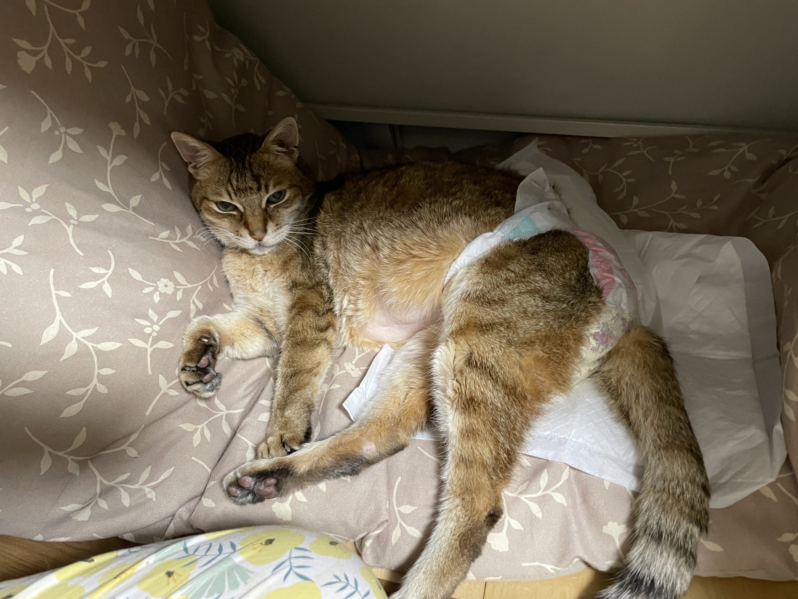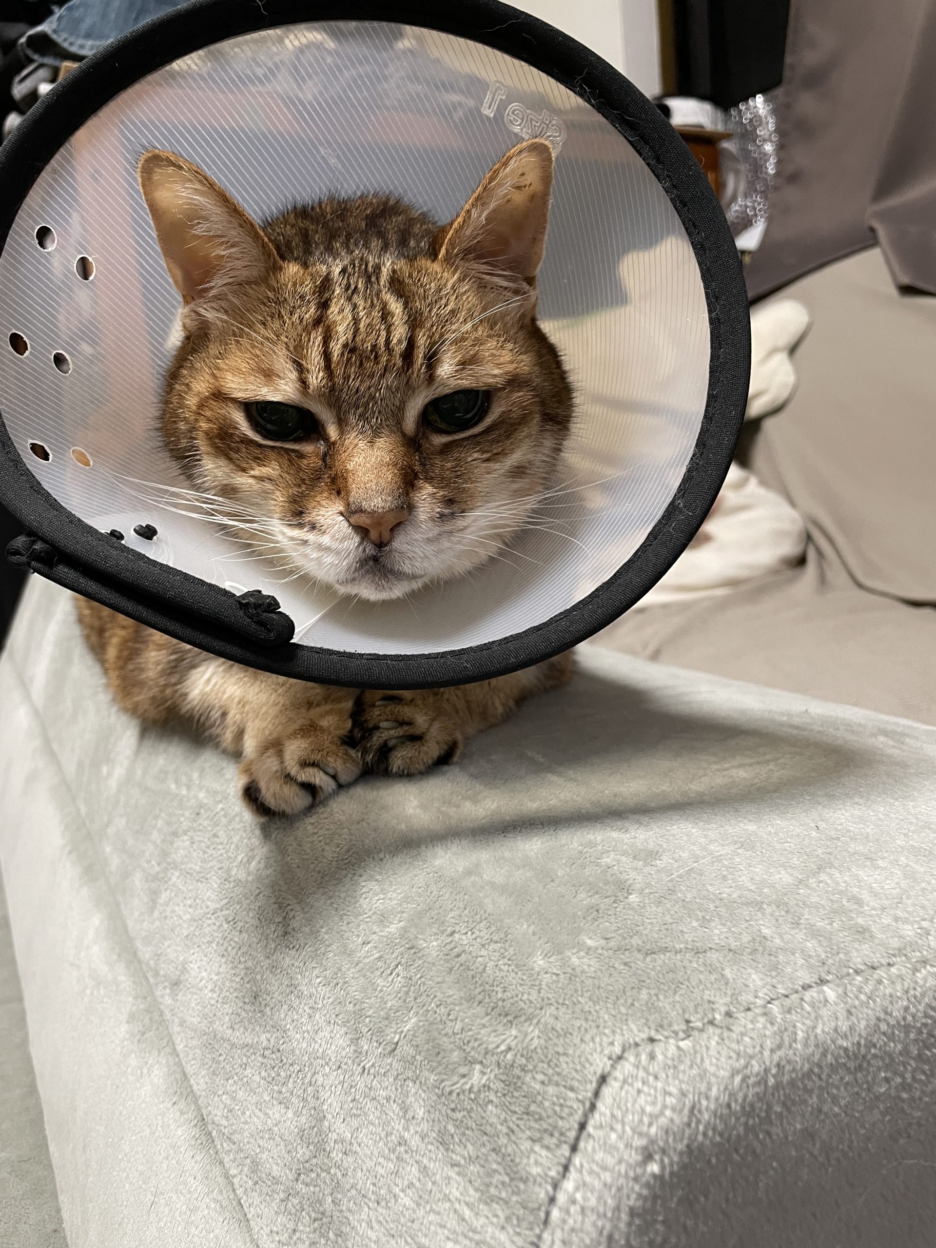 ↓黒い下痢の後、オムツをはずしたらお尻を舐めまわして腫れあがったためカラー着用。不服そう(笑)